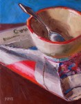 I carry my soggy cereal and my clean spoon out of the kitchen.